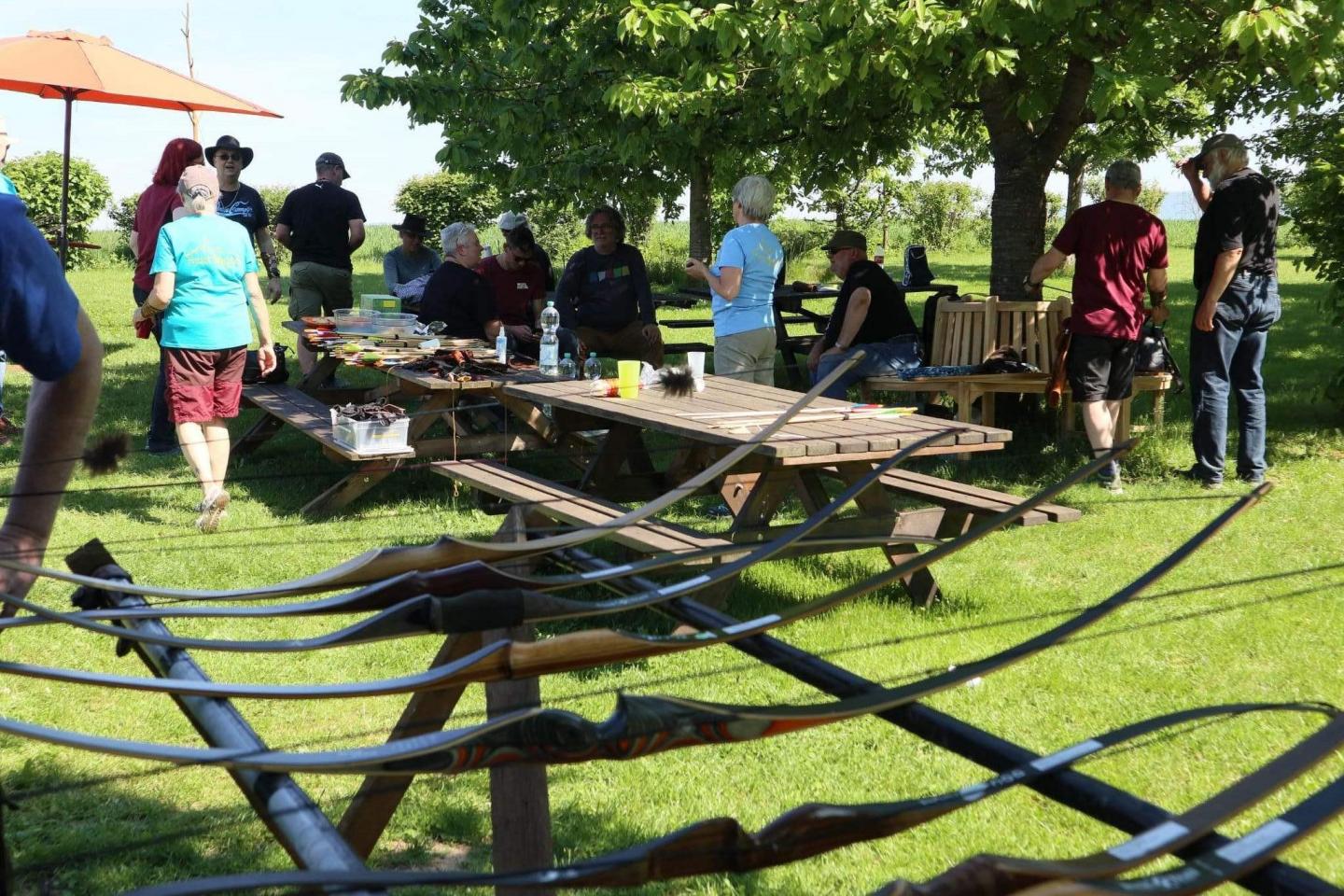 Nachdem unser Mitglied Pit seit Mai 2022 aktiv dem Bogensport nachgeht und für Vereinsaktivitäten unsere Pavillone ausgeliehen hat, was bei einigen von uns Intreresse weckte, wurden wir zu einem Bogenschieß-Schnupperkurs eingeladen. Wir fuhren also im Mai 2024 mit 11 Leuten und bei Sonnenschein nach Kirchheim unter Teck auf die Anlage der Tradbogner von der Teck und sahen in etwas enttäuschte Gesichter.